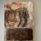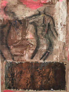 stukje hout, schuurpapier en boomschors in verwerkt. De twee lichamen (bodies) zijn met houtskool getekend. Het schilderij is afgewerkt met een transparante lak.