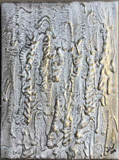 Running Gold is een schilderij waarin de verf in dikke klodders van het doek af druipen. Door gouden verf te gebruiken lijken de druipers van vloeibaar goud te zijn.