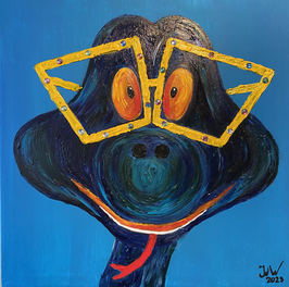 Snake is een schilderij met een slang met een grote opvallende bril. Het schilderij is gemaakt met acrly verf en afgewerkt met een transparante lak.